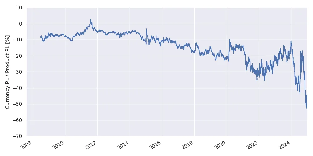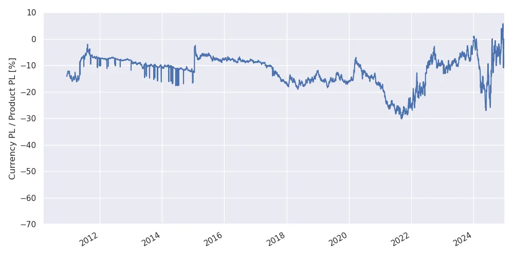 While the currency effect can be quite important in the short term (e.g. up to 50% for a 2024 acquisition), for a buy date between 2008 and 2018, the currency PL is at most 20% of the product PL, matching with the arguments above.